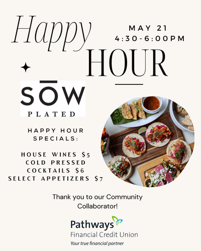 Join us for a Happy Hour and networking event on the beautiful patio at SOW Plated. Chamber events are casual and welcoming, giving you the chance to build both personal and professional connections in a relaxed, low-pressure setting. Happy Hour specials include: $5 House Wines, $6 Cold-Pressed Cocktails and $7 Select Appetizers.