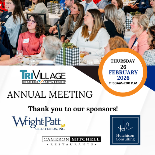 The Tri-Village Chamber Partnership Board of Directors and Staff would like to invite you to attend the 2026 Annual Meeting. The Chamber leadership team will review highlights of 2025 and share what will be coming in 2026. Join us at 11:30 for a networking opportunity and meet our sponsors and exhibitors.
