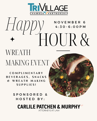 Join us for an evening of creativity, connection, and community. Carlile Patchen & Murphy LLP is proud to host a festive Happy Hour in partnership with the Tri-Village Chamber Partnership this November.